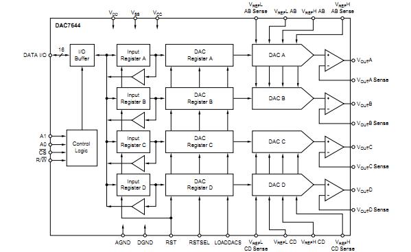 The DAC7644E is a 16-bit, quad voltage output digital-to-analog converter with guaranteed 15-bit monotonic performance over the specified temperature range. The DAC7644E accepts 16-bit parallel input data, has double-buffered DAC input logic (allowing simultaneous update of all DACs), and provides a readback mode of the internal input registers. Programmable asynchronous reset clears all registers to a mid-scale code of 8000H or to a zero-scale of 0000H. The DAC7644E can operate from a single +5V supply or from +5V and –5V supplies. Applications include: (1)process control; (2)closed-loop servo-control; (3)motor control; (4)data acquisition systems; (5)dac-per-pin programmers.