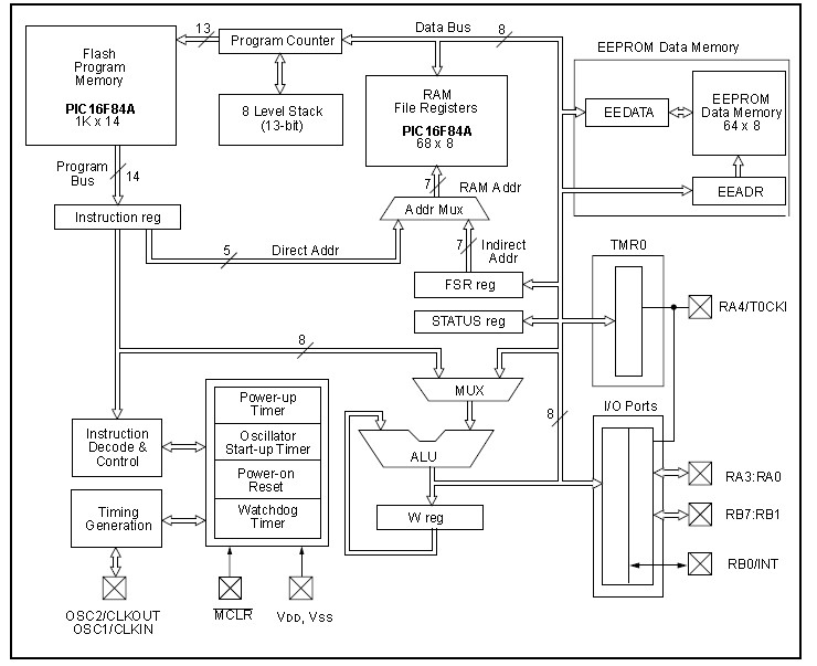 PIC16F84A-04I/SO features: (1)Only 35 single word instructions to learn; (2)All instructions single cycle except for program branches which are two-cycle; (3)1024 words of program memory; (4)68 bytes of data RAM; (5)64 bytes of data EEPROM; (6)14-bit wide instruction words; (7)13 I/O pins with individual direction control; (8)1000 erase/write cycles Enhanced Flash program; (9)memory; (10)Power-on Reset (POR), Power-up Timer (PWRT), Oscillator Start-up Timer (OST); (11)Watchdog Timer (WDT) with its own on-chip RC oscillator for reliable operation.